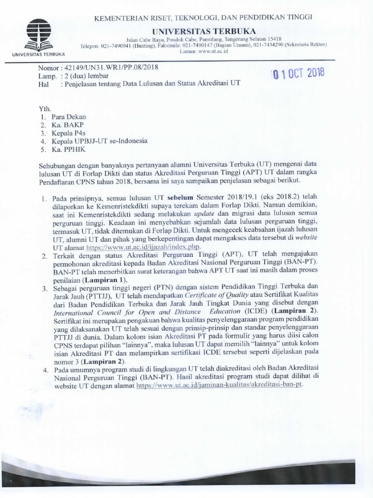Akreditasi universitas terbuka 2018. Kamis 03 januari 2019 2252 dibaca batas waktu ujian komprehensif untuk perpanjangan tidak bayar sppukt semester genap tahun akademik 20182019 batas akhir bagi mahasiswa yang lulus ujian komprehensif sebelum tanggal 31 desember 2018 tidak diwajibkan membayar sppukt. Dengan sistem ini biaya kuliah dibayarkan tiap semester tanpa ada lagi uang gedung uang pangkal dan lain lain. Mutawali yang merupakan rektor ke 12 yang memimpin perguruan tinggi keagamaan islam yaitu universitas islam negeri mataram telah mengalami bebrapa kali perubahan sejak didirikan 52 tahun silam bermula.